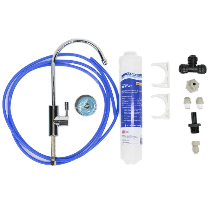 The kit includes a John Guest quick connect tap adaptor which screws onto the bottom of the tap to connect the ¼” tubing. - Cut into your 12mm line and add fittings