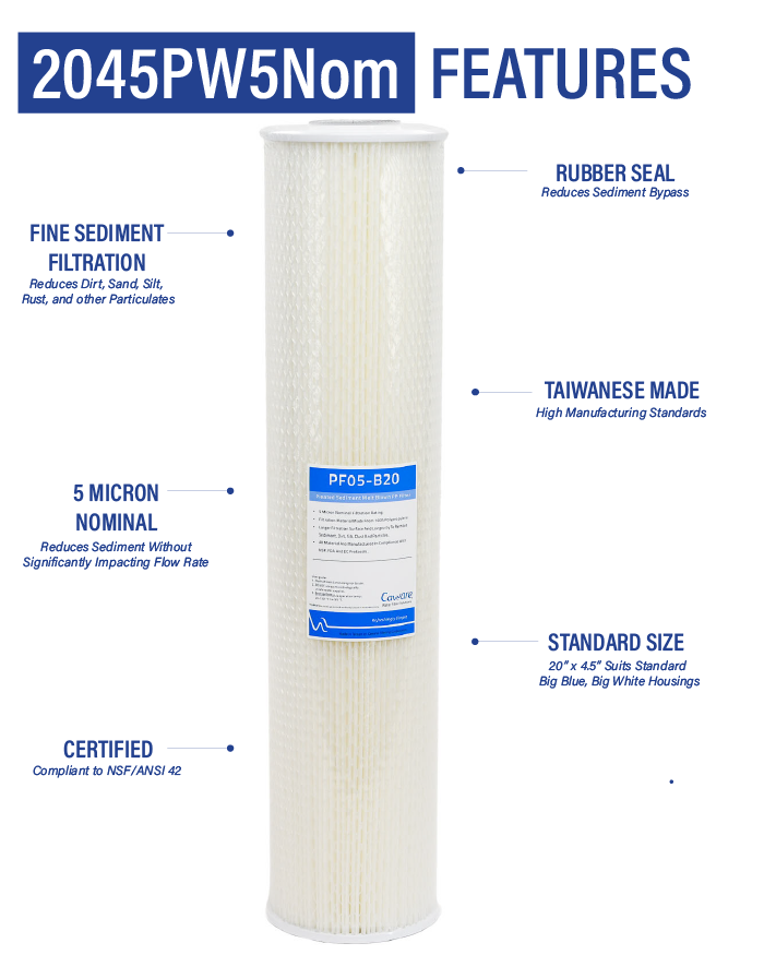 Premium long life Pleated Washable Sediment Filter with rubber end seals. 2045PW5Nom – 5 Micron Nominal rated 20 inch x 4.5 inch.