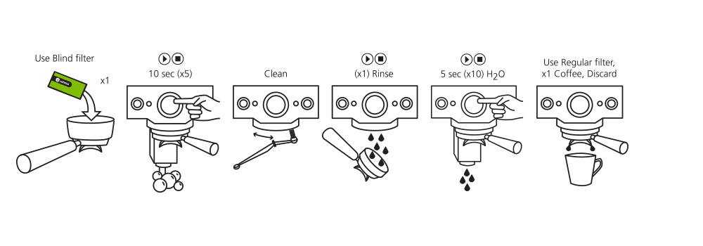 - For daily cleaning add 1 EVO Sachet into the group handle and insert as if brewing espresso. If the machine is cleaned less often, use 2 EVO Sachets.