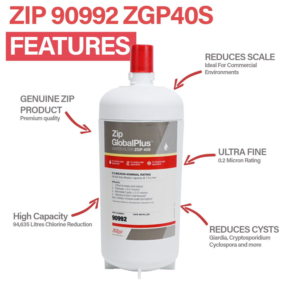 Genuine Zipâ„¢ 90992 water filter to suit Zip GlobalPlus series systems. An ultra-fine premium filter rated at 0.2 microns. Produces extremely pure water. Ideal for both commerical and residential applications.