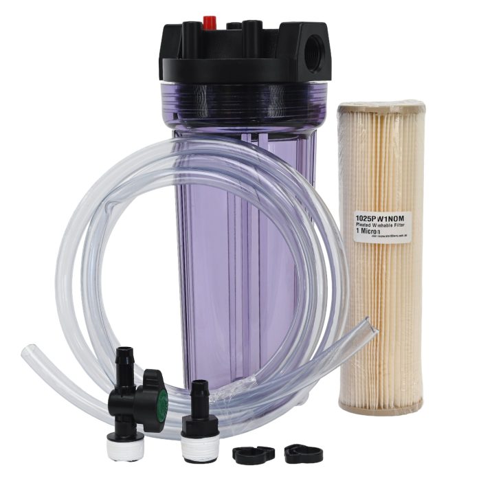 Transparent 10″ filter housing with 3/4″ Bsp ports with air bleed button on top, housing has screw in 13mm barbed hose fittings with a shut off tap on the outlet side to help remove air from the filter, also helps control flow if bottling. 2 meters of 12.5mm ID clear food grade tubing is supplied.
