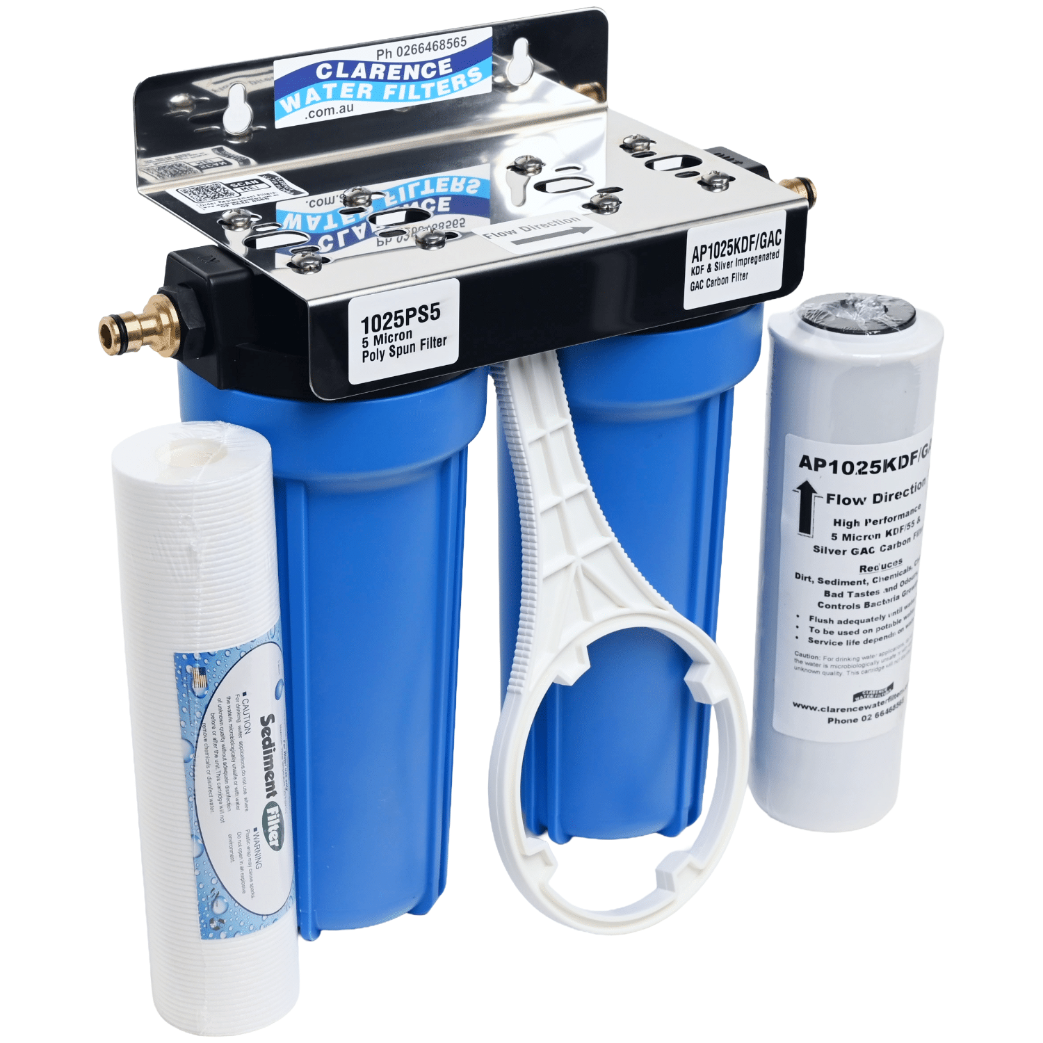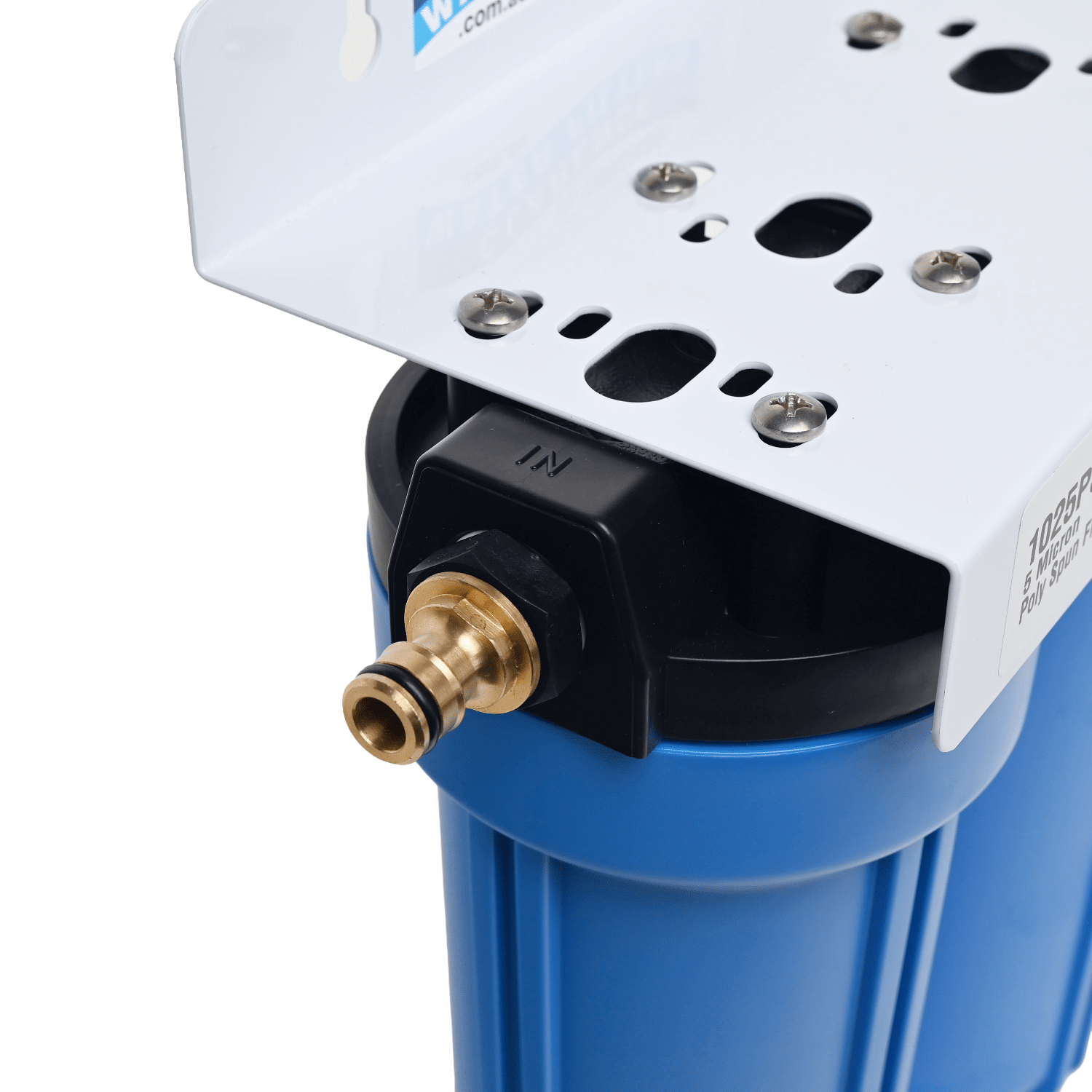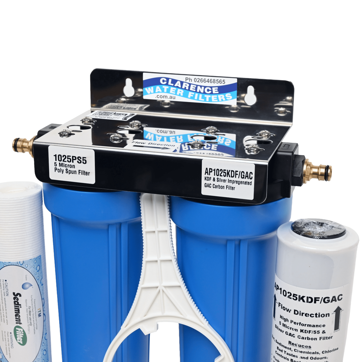 Quality heavy duty high pressure filter housings. This 10″ Twin Filter System 3/4″ BSP threaded in/outlet ports with Brass click on hose fittings that screw into the housings. Comes with your choice of a white powder coated mounting bracket or stainless steel mounting bracket.