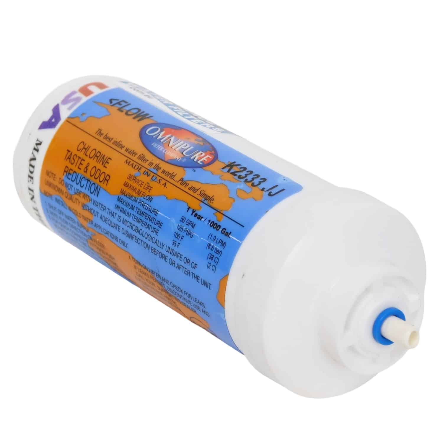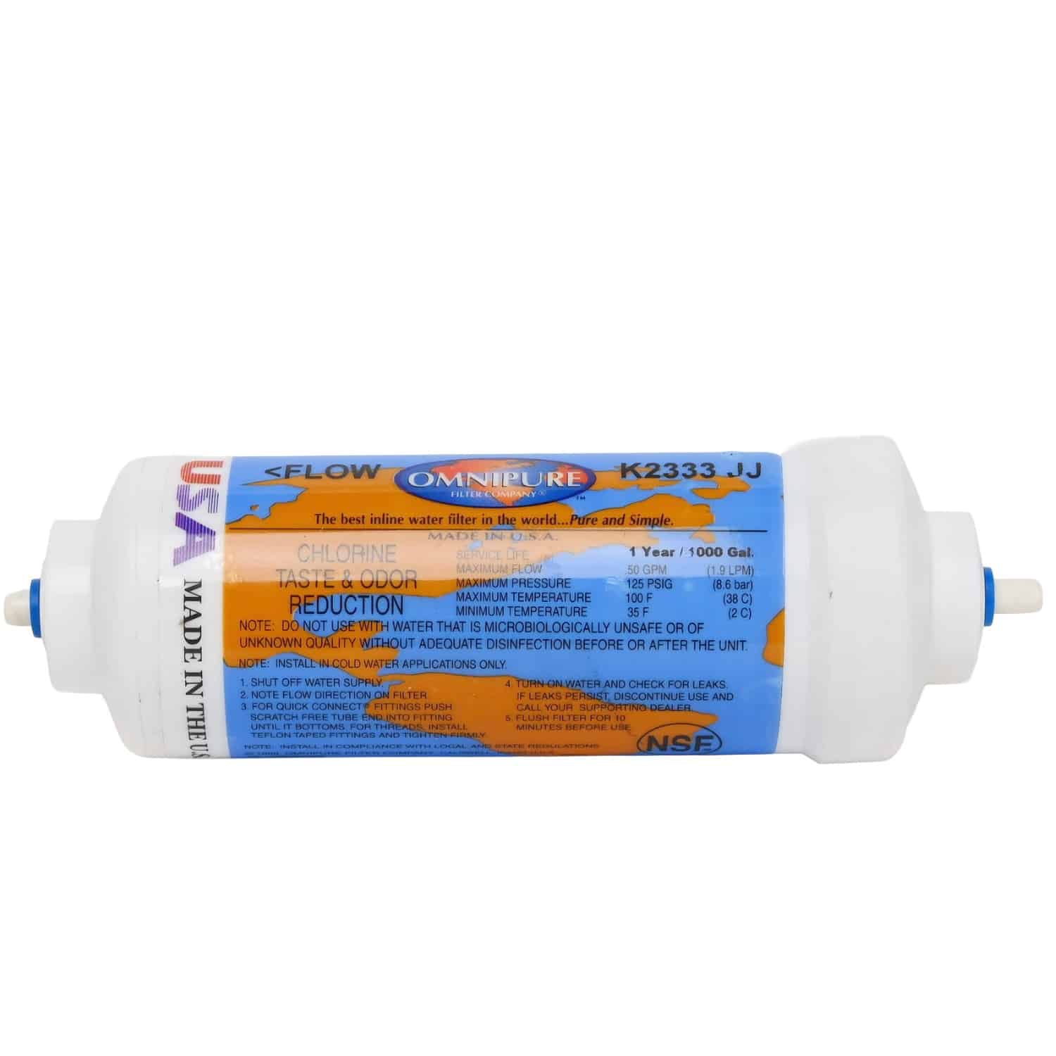 Omnipure K2333 in-line filter with 1/4″ tubing push-in quick connection fittings.