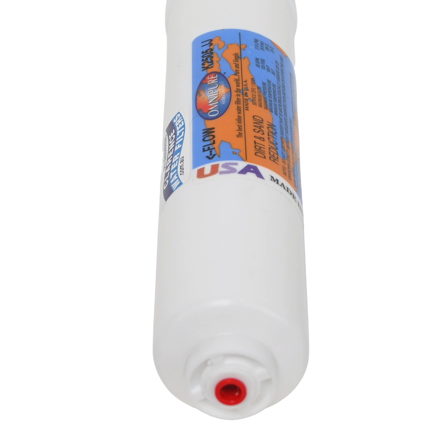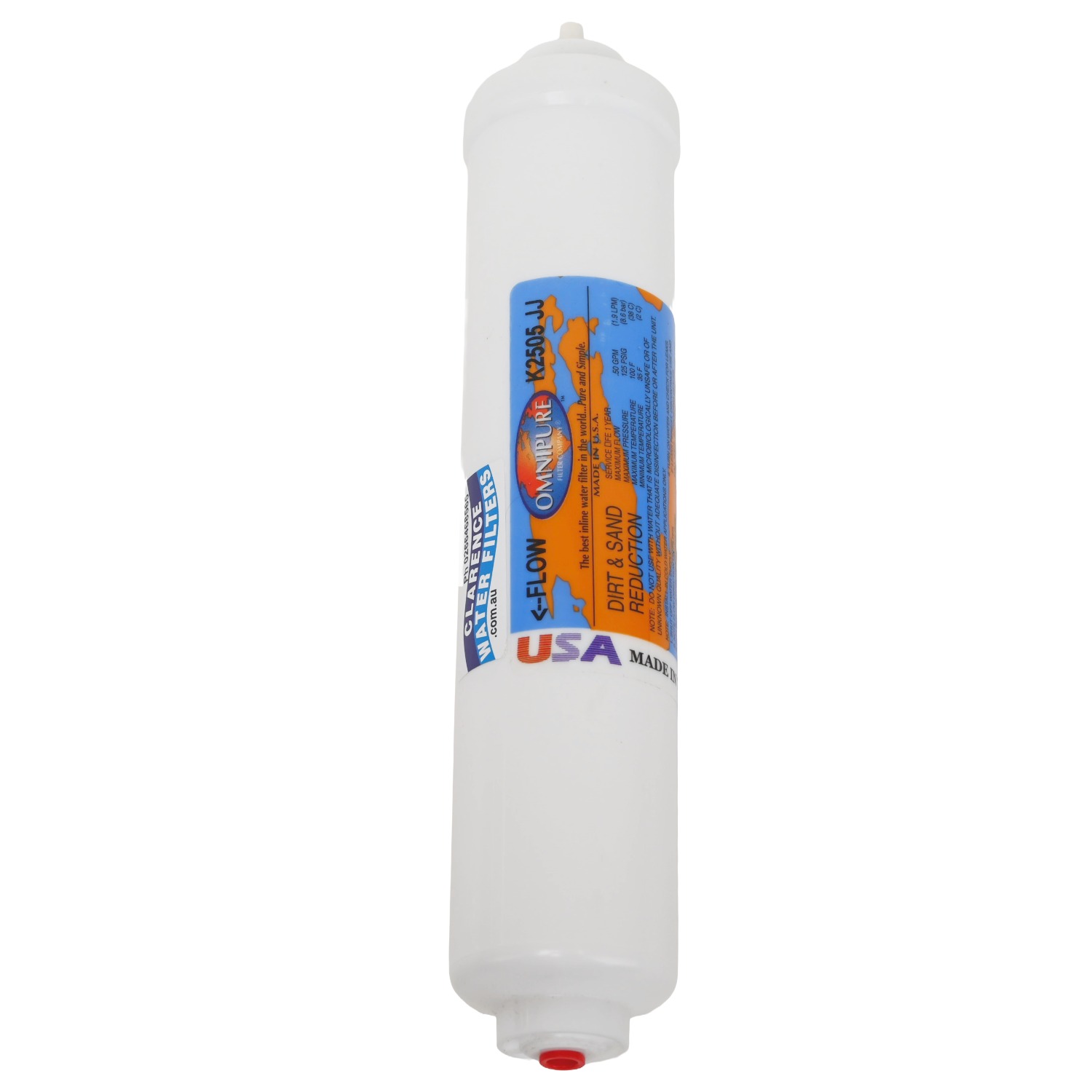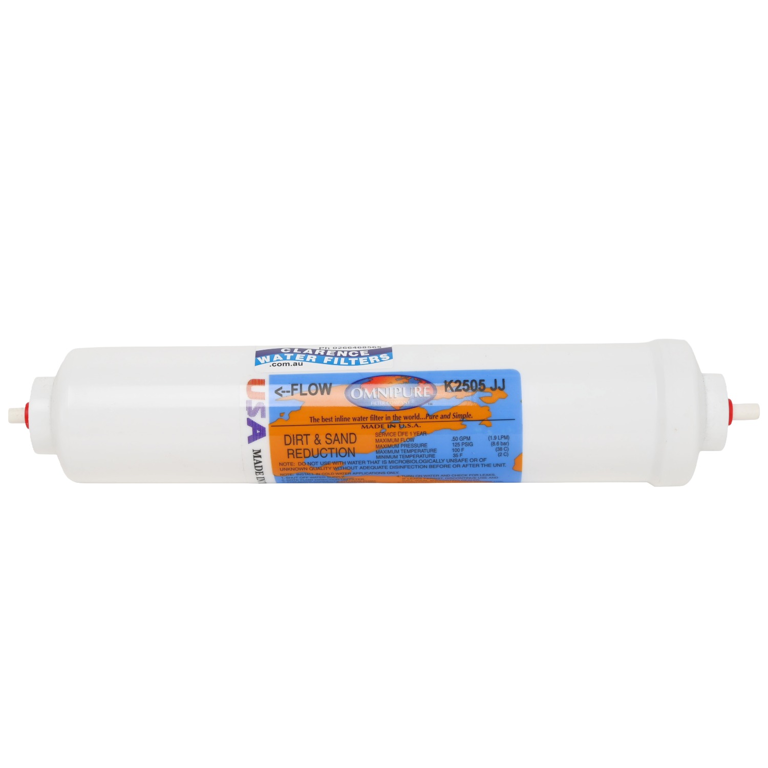 Omnipure K2505 JJ sediment in-line filter has built-in 1/4″ John Guest quick connect tube fittings at each end of the filter.