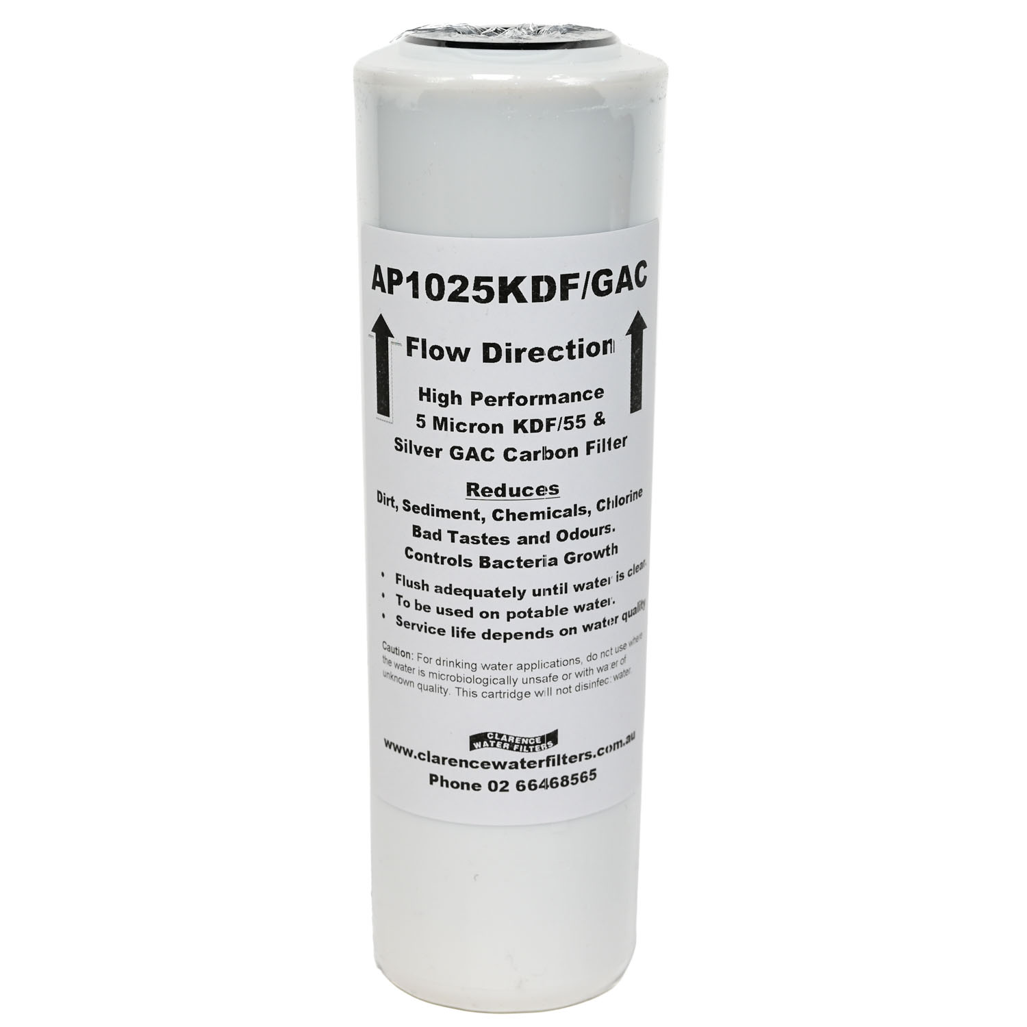 High Flow 10″ KDF and Silver Impregnated Granular Coconut Carbon Water Filter ideal for Under Sink Water Filter Systems and Point of Entry Caravans / RV filter systems. High Flow 10″ KDF and Silver Impregnated Granular Coconut Carbon Water Filter ideal for Under Sink Water Filter Systems and Point of Entry Caravans / RV filter systems.