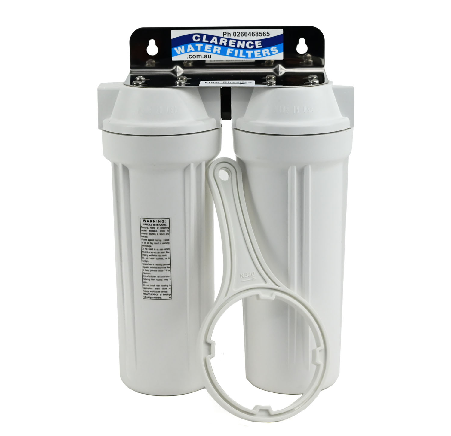 - Twin 10″ x 2.5″ Water Filter Housing on bracket with 1/2″ nipple connections